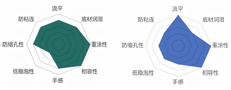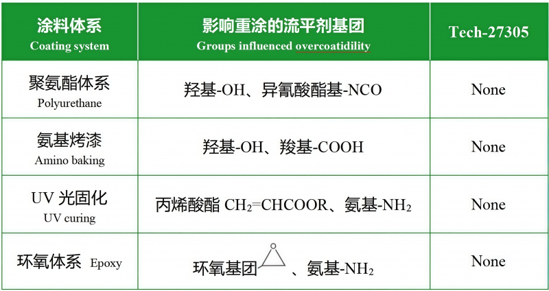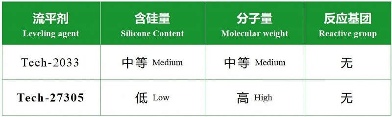 除此之外,Tech-27305流平劑不含可能影響重涂的官能團,避免因端基參與樹脂的交聯反應而使得體系失去重涂性。