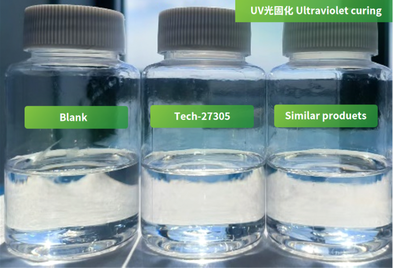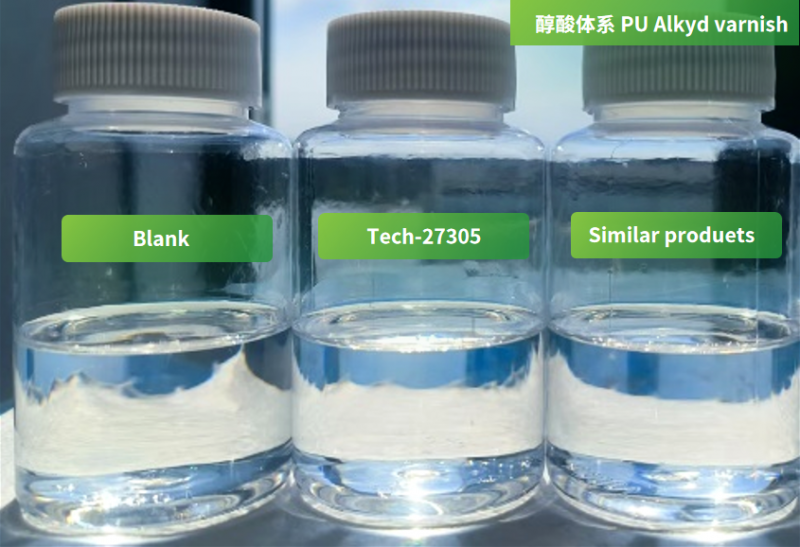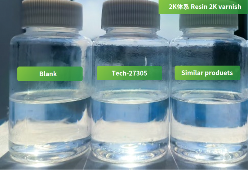 在四大體系(2KPU、UV、環氧、醇酸)中,Tech-27305流平劑的相容性均表現為“與空白樣無異”,添加后不影響透明度。