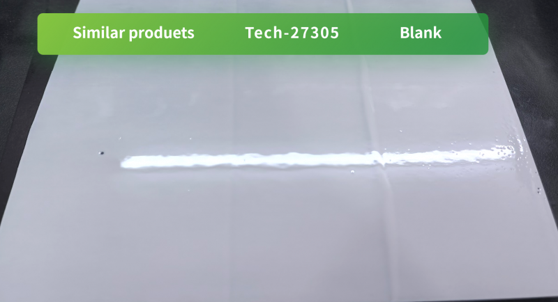 在刮涂測試中,對于比國際產品,Tech-27305表現出優異的防縮孔性,流平性能則兩者接近,加入流平劑的體系對比空白對照樣流平效果均有顯著提升。